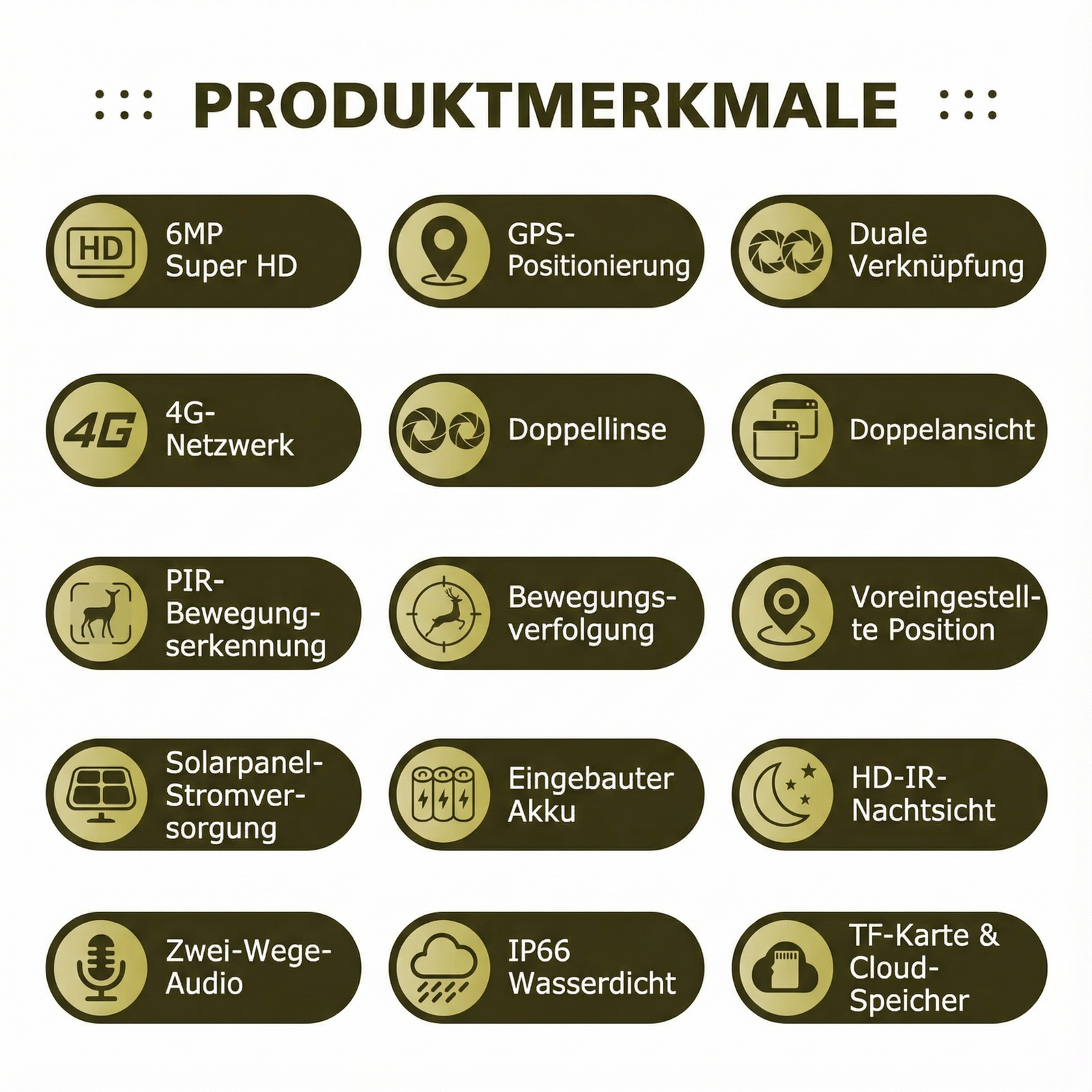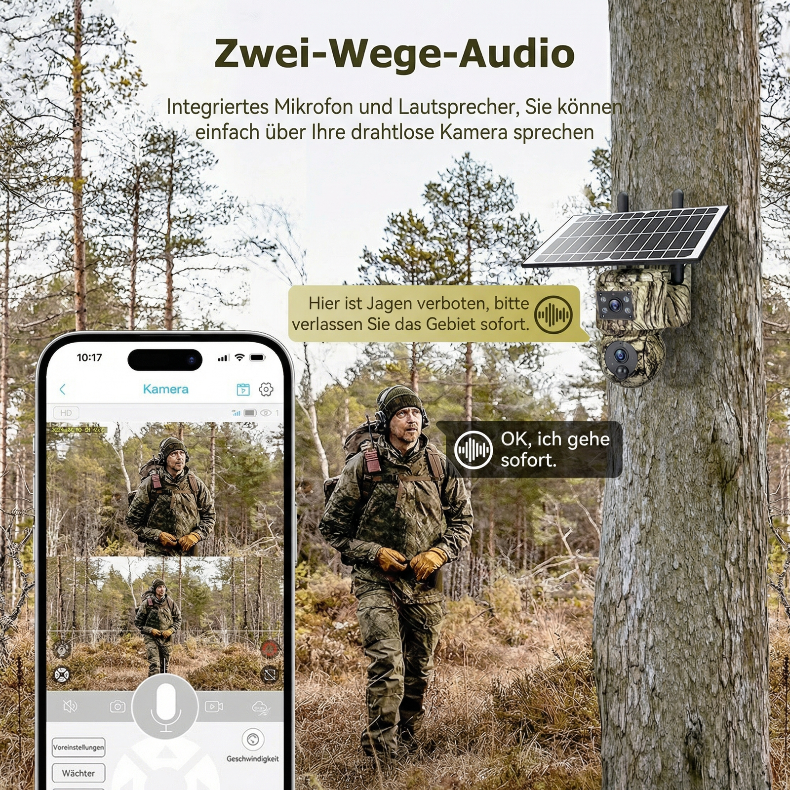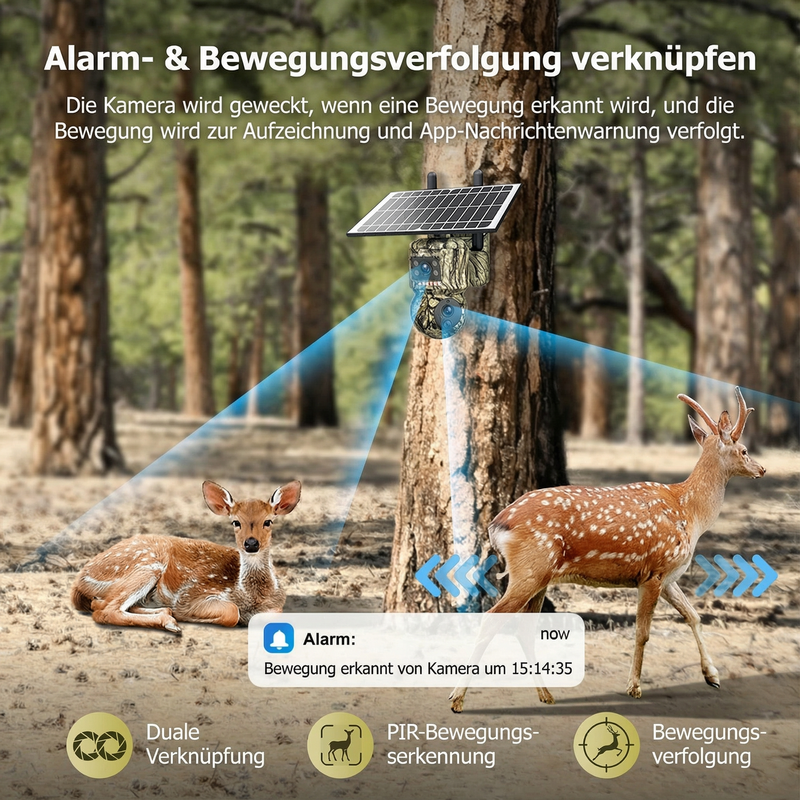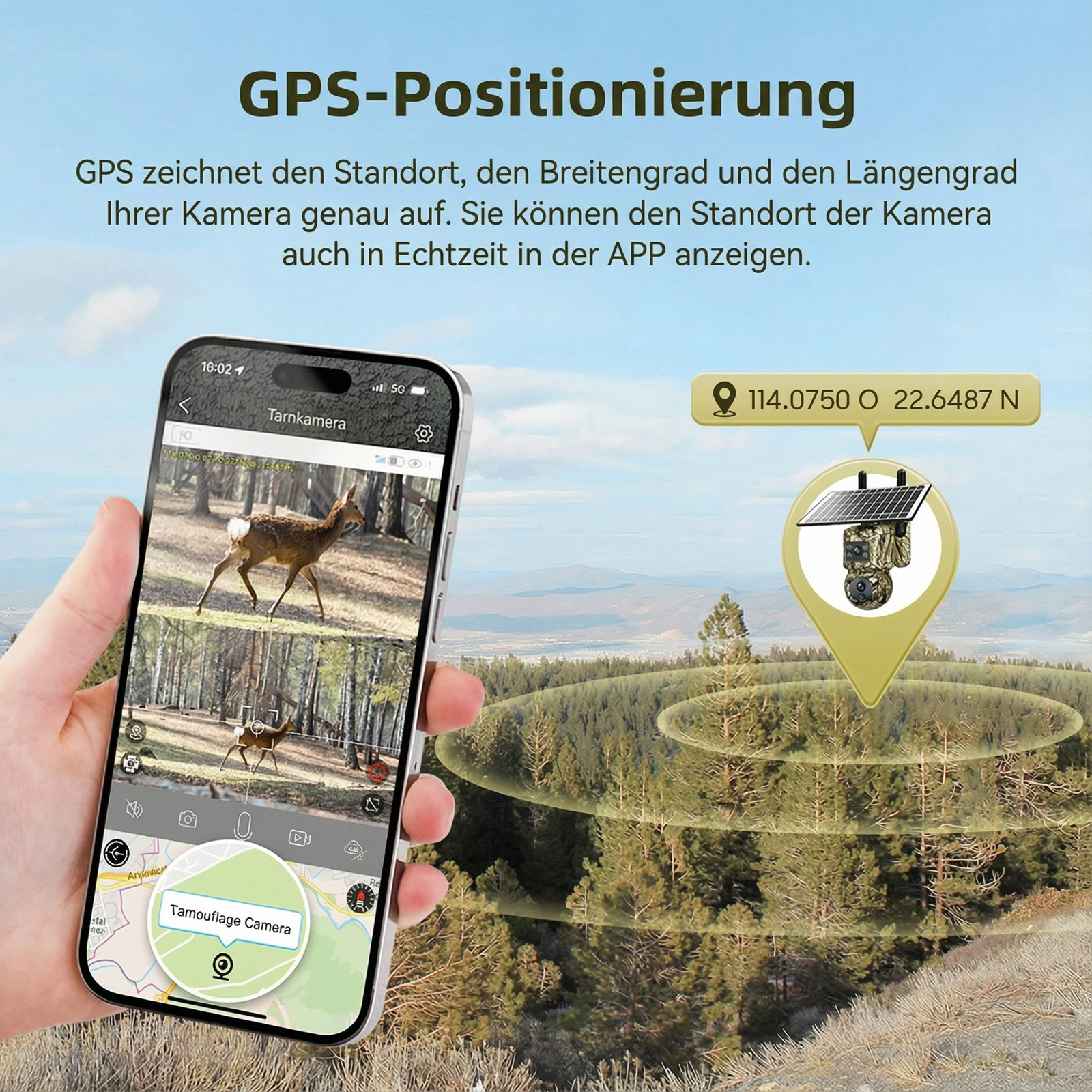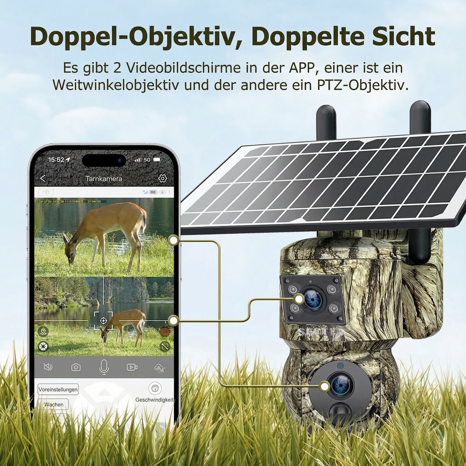 Ein starker 20.000 mAh Akku liefert über 6 Wochen Betriebszeit. Das mitgelieferte 6W-Solarpanel sorgt für Energie – auch bei schwachem Licht. Die Kamera ist mit Schutzklasse IP66 gegen Regen, Staub und Temperaturen bis –30 °C geschützt.